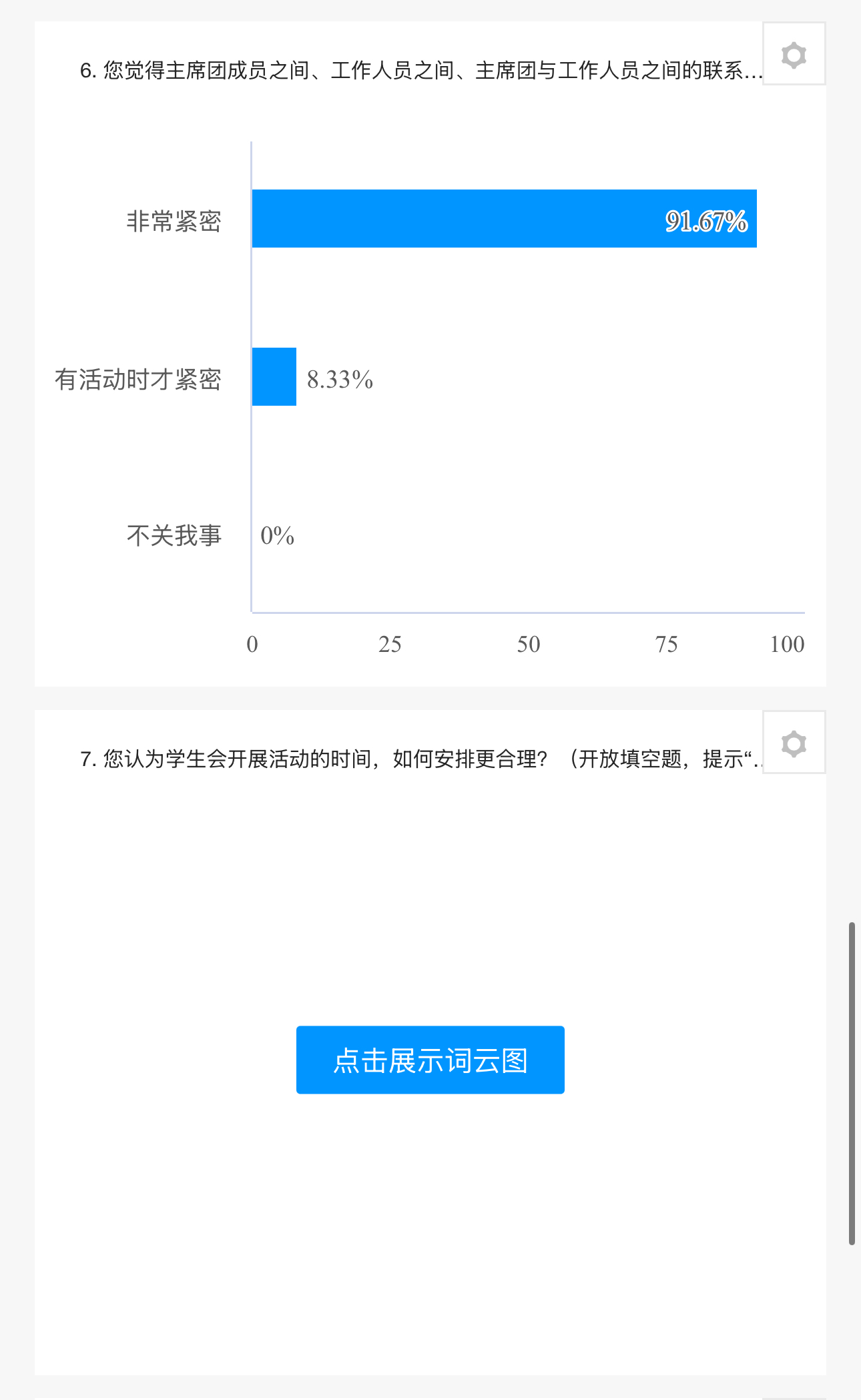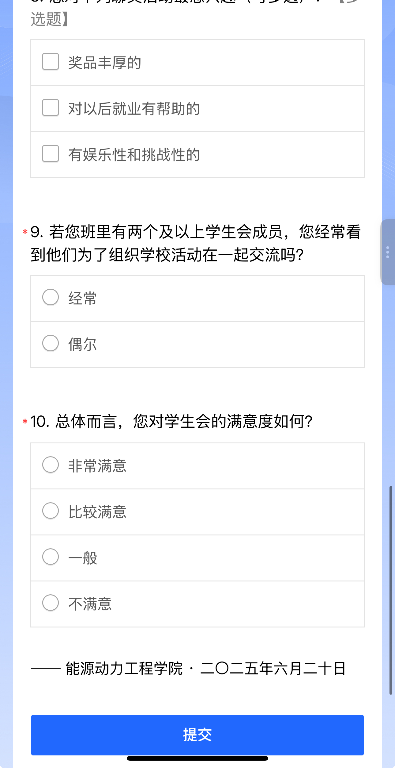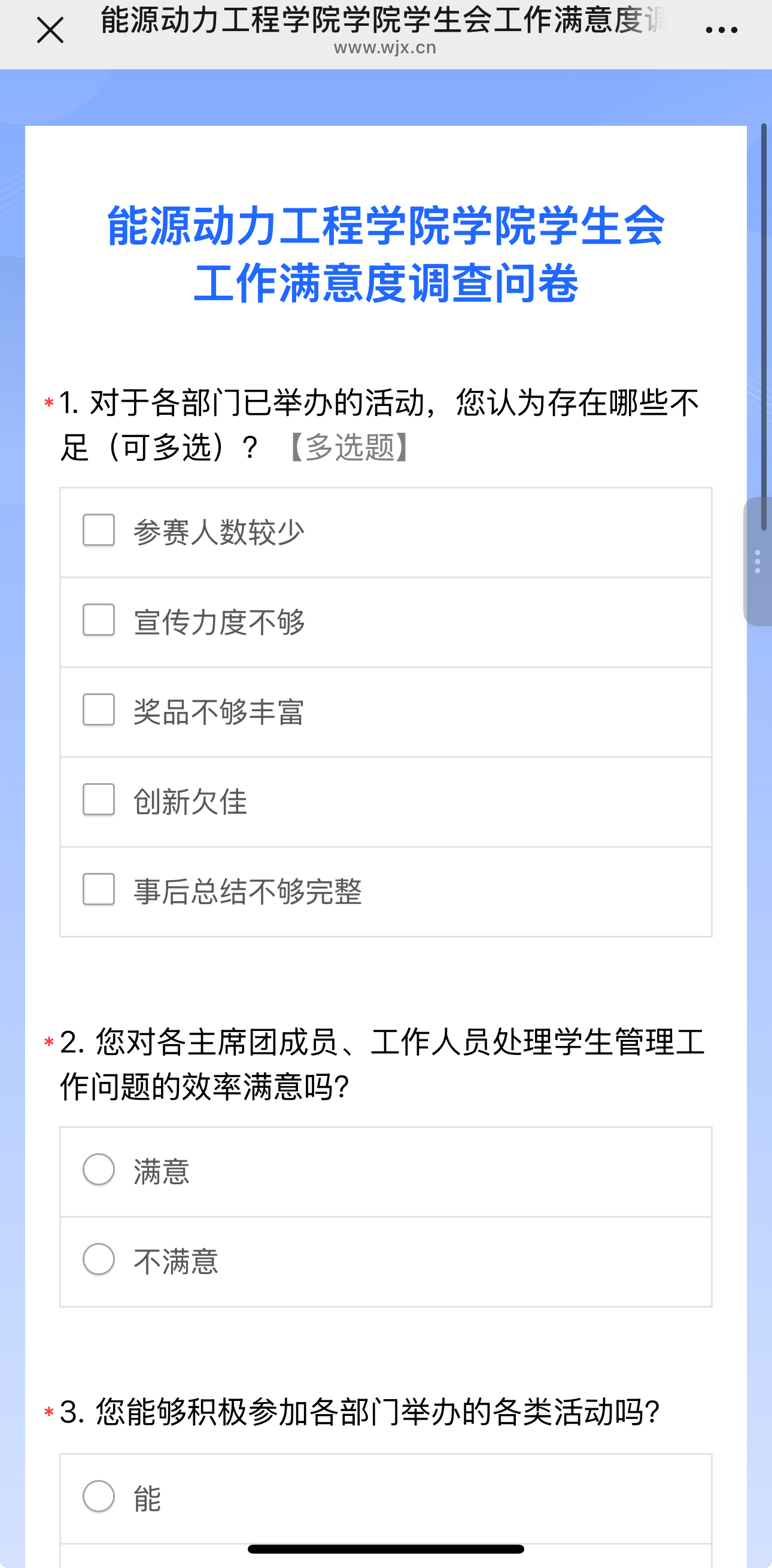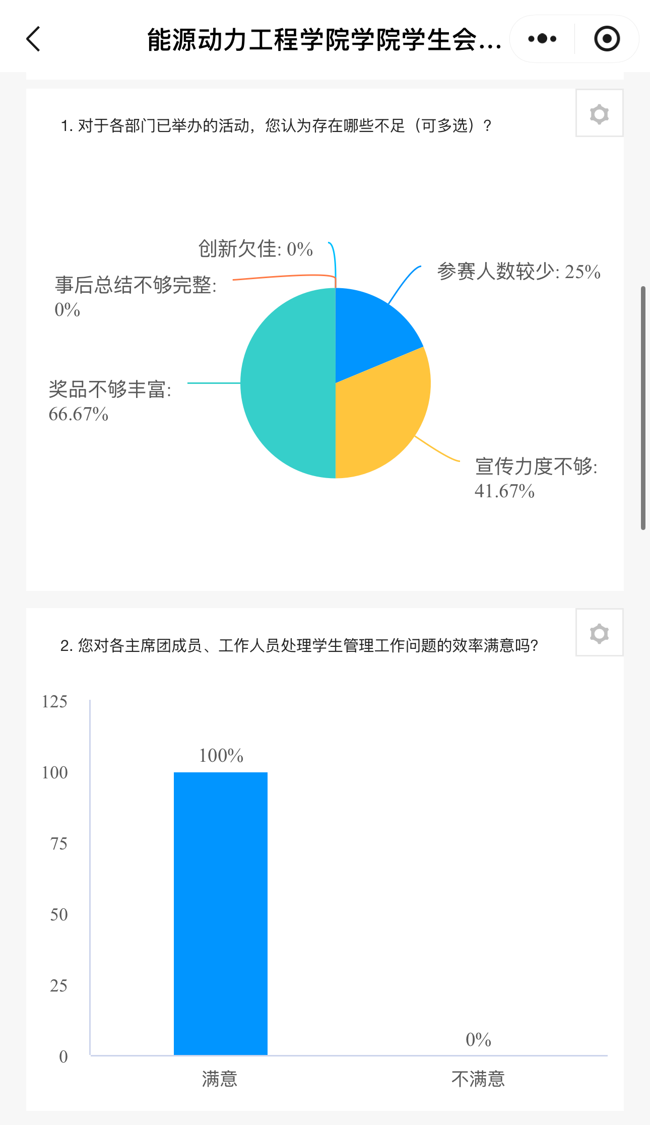 从回收的问卷结果来看,同学们对学生会过去一段时间的工作给予了高度认可。大家普遍表示,学生会在活动组织、权益维护等方面切实发挥了作用,真正做到了为同学服务,这份满意反馈也为学生会后续工作注入了更强动力。