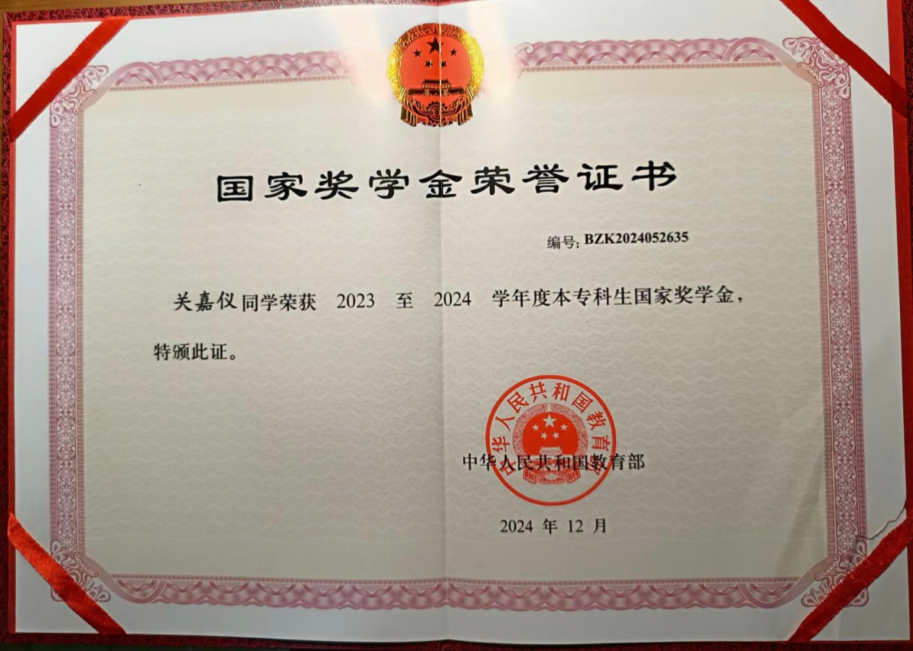 关嘉仪积极投身校园实践与社会服务,作为学院团委副书记,组织参与多项学院活动,获评“优秀学团干部”。她热心公益,参与“返家乡”“三下乡”等社会实践活动,担任中国两弹城公益员,获评校级“标兵志愿者”“优秀志愿者”,以实际行动传递青春正能量。