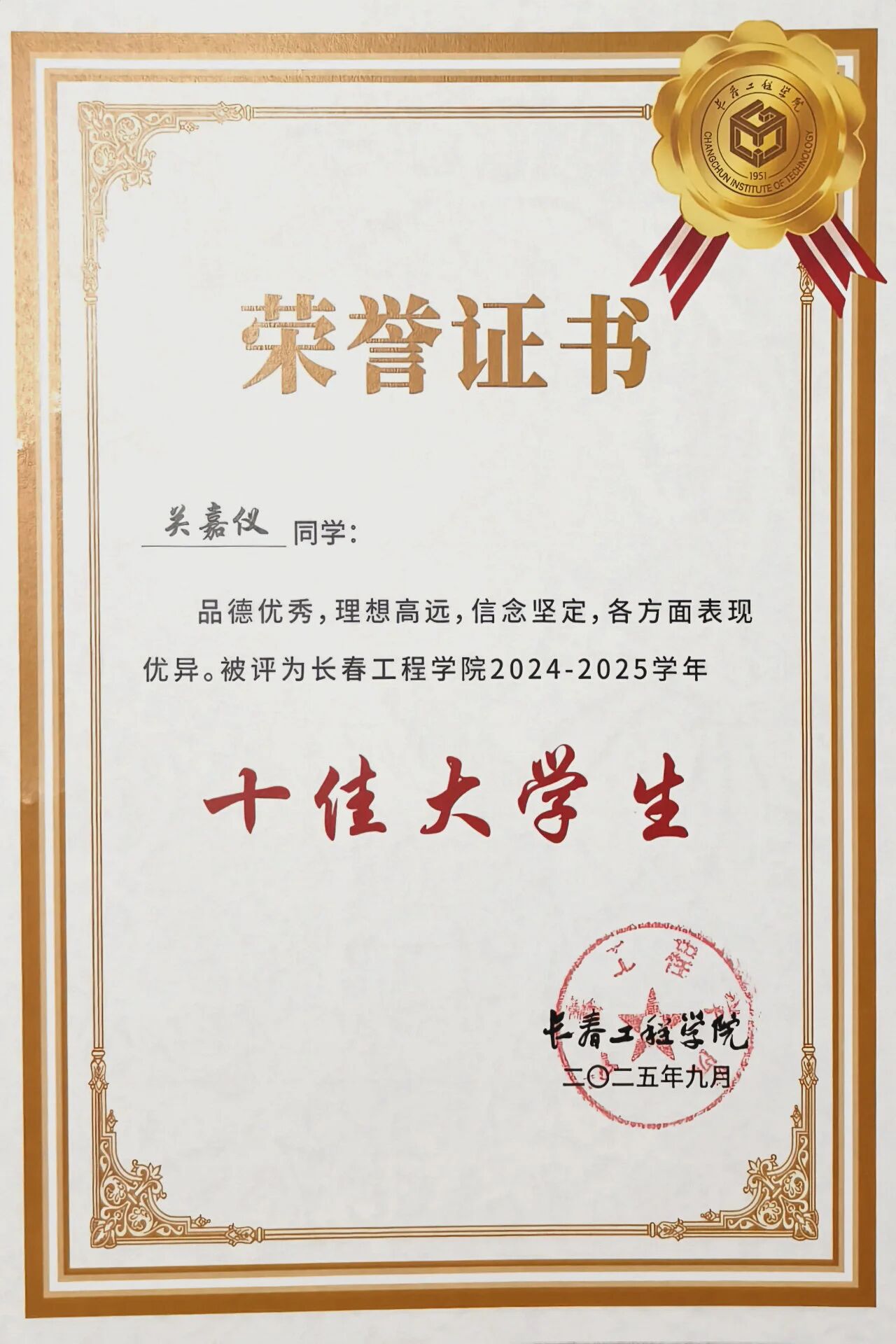 关嘉仪,中共预备党员,现任能源动力工程学院团委副书记。她始终以“少年不惧岁月长,彼方尚有荣光在”为座右铭,三年综合测评稳居专业第二、班级第一,累计获各类奖项29余项,其中省级及以上荣誉15项,是全面发展、奋发有为的新时代大学生典范。关嘉仪始终将学业放在首位,成绩名列前茅,连续获得长春工程学院一等奖学金、吉林省政府奖学金,并荣获国家本专科生奖学金。多次获评校级“优秀学生”“优秀学生干部”“学习标兵”等荣誉称号,展现出扎实的专业基础与全面的综合素质。