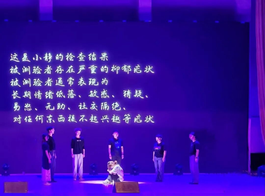 初赛舞台上,演员们以细腻精湛的表演,通过颤抖却富有张力的肢体动作、饱含深情的独白,将抑郁症患者从情绪崩溃到逐步治愈的内心历程层层展开。背景音乐与表演节奏紧密契合,渐进式渲染情感氛围,让评委与观众沉浸式感受角色的挣扎与自我救赎,深刻体悟心理疾病对青少年的冲击。演员们对比赛主题的精准把控与极具感染力的舞台演绎,使能动学院在初赛中脱颖而出,最终以第一名的优异成绩顺利晋级决赛。