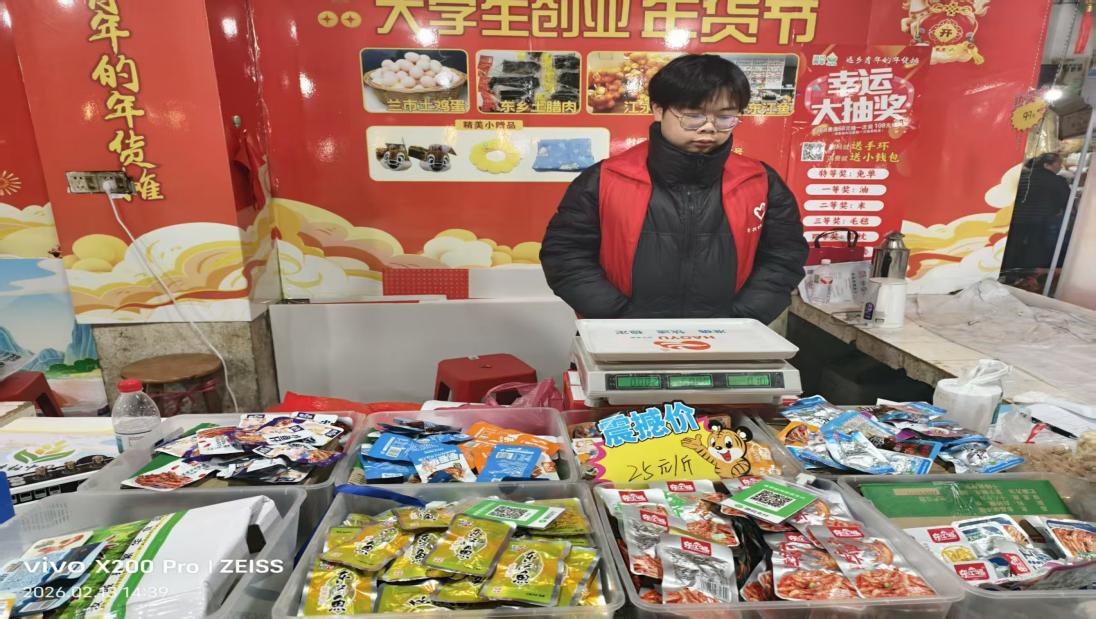 寒假返乡后,我报名成为当地团委志愿者,在市场经营年货小摊,宣传家乡特产。 我每天整理摊位、补货并热情吆喝,与顾客互动,察言观色提供情绪价值,还成功促成了一笔小鱼干的销售,也更了解了家乡特色。