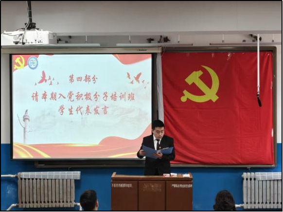 本期党校培训班班长赵梓博同学代表全体学员上台发言,他号召全体学员珍惜此次党校学习的宝贵机会,严守培训纪律、端正学习态度,认真钻研党的理论知识,主动交流学习心得、积极参与实践活动;同时勉励大家以党员标准严格要求自己,在学习中坚定理想信念、锤炼党性修养,同学之间互帮互助、共同进步,以饱满的热情和端正的学风完成各项学习任务,以实际行动向党组织靠拢,努力成为有理想、敢担当、能吃苦、肯奋斗的新时代青年。